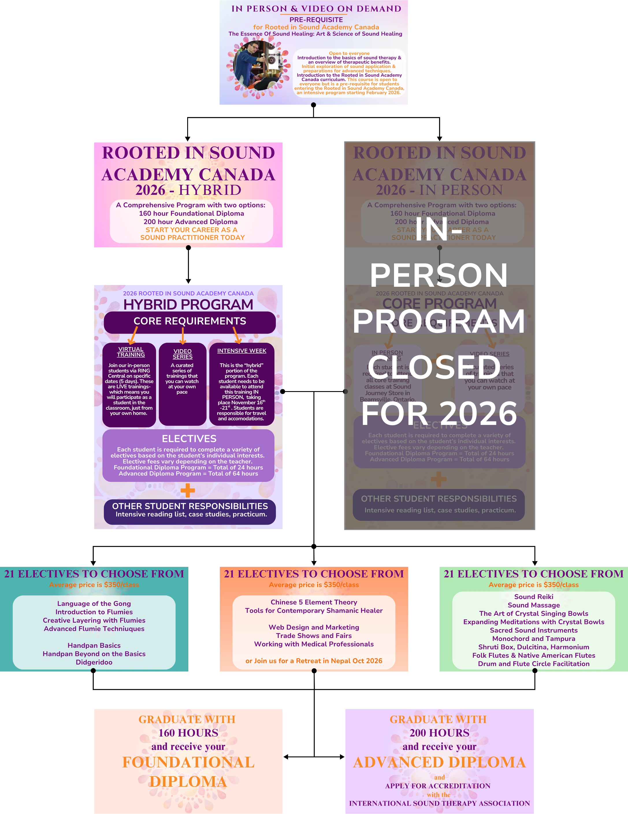- Rooted in Sound Academy Canada puts a wide variety of instruments in your hands, teaching you specific techniques to create the most effective sounds from each instrument. Once you complete your 135 hours of Core Module classes, you can then spend either an additional 24 hours or 64 hours focusing in greater detail how to play specific instruments of your choice. By taking the 24 hours of electives, you will graduate with the Foundational Diploma. WIth 64 hours of electives, you will graduate with The Advanced Diploma. You may then apply for certification with the International Association of Sound Therapists.,